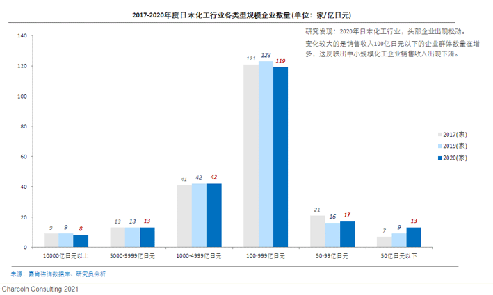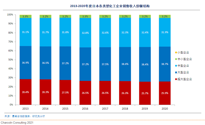 研究发现:日本化工行业头部企业结构稳定,销售收入规模顺位也几乎没有变化。但2020年度中小规模化工企业增速下滑较大,抗风险能力弱。而超大型企业和大型企业的销售收入增速下滑幅度相对较小。