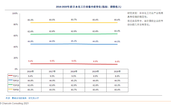 日本化工行业产业集中度很高。
